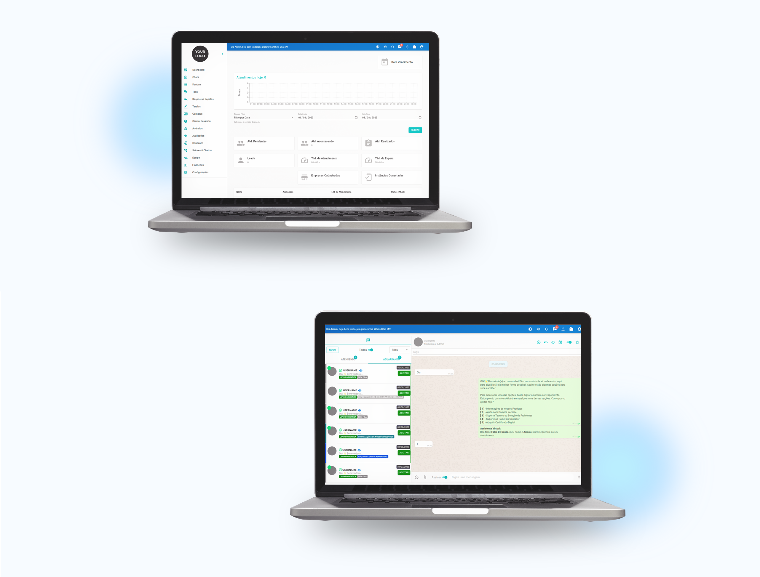 Relatórios completos em tempo real de todos os atendimentos, com opção de exportar contatos.